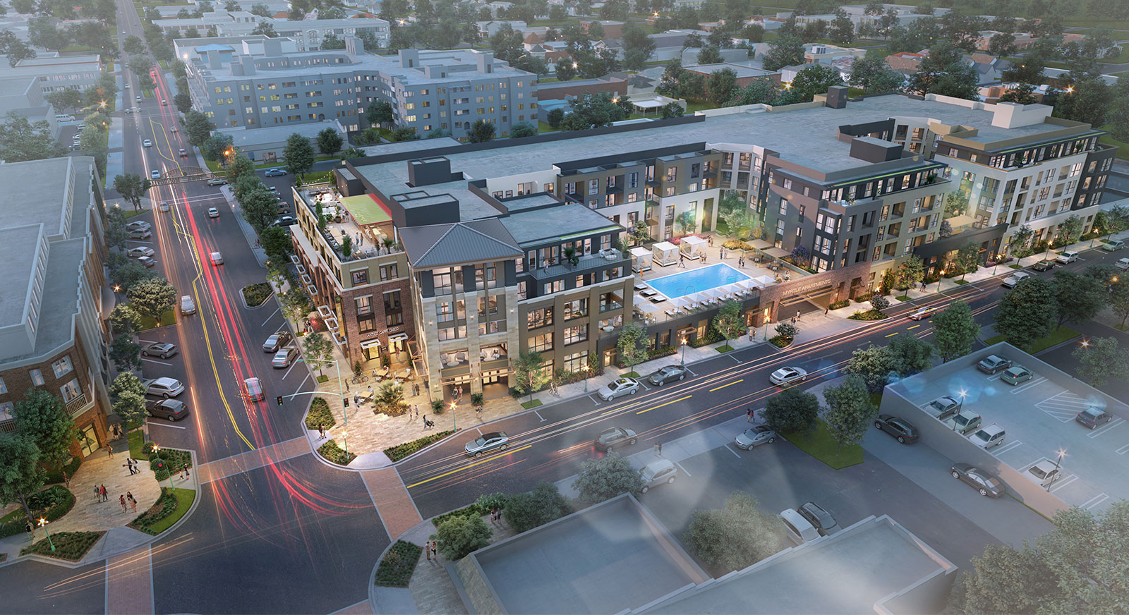 The development also delivers street-front commercial space, a publicly accessible plaza, and enhanced sidewalk improvements, reinforcing an active pedestrian environment. Together, these elements implement the City’s long-term vision for the South Myrtle Avenue Corridor and the Old Town Extension District, contributing to a more connected, walkable, and vibrant urban neighborhood.