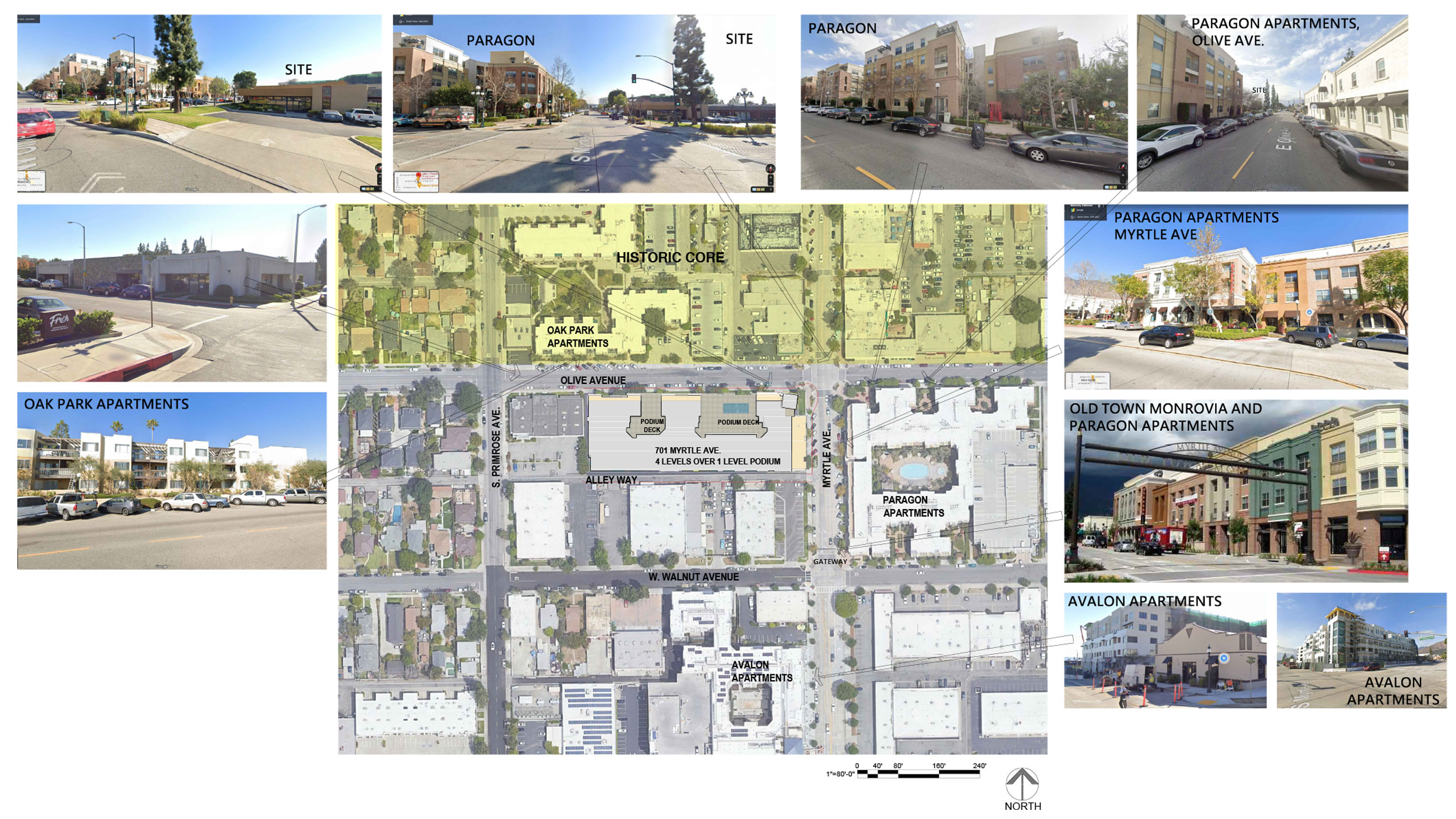 Located at the southwest corner of West Olive Avenue and South Myrtle Avenue, the site lies within the Old Town Extension District, one of three districts that comprise the South Myrtle Avenue Corridor. This corridor was established through Monrovia’s 2008 General Plan update to guide the evolution of South Myrtle Avenue into a more walkable, vibrant, mixed-use environment—reinforcing the link between Old Town and the City’s transit infrastructure.